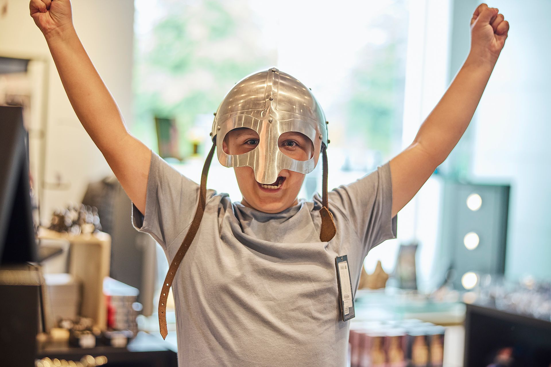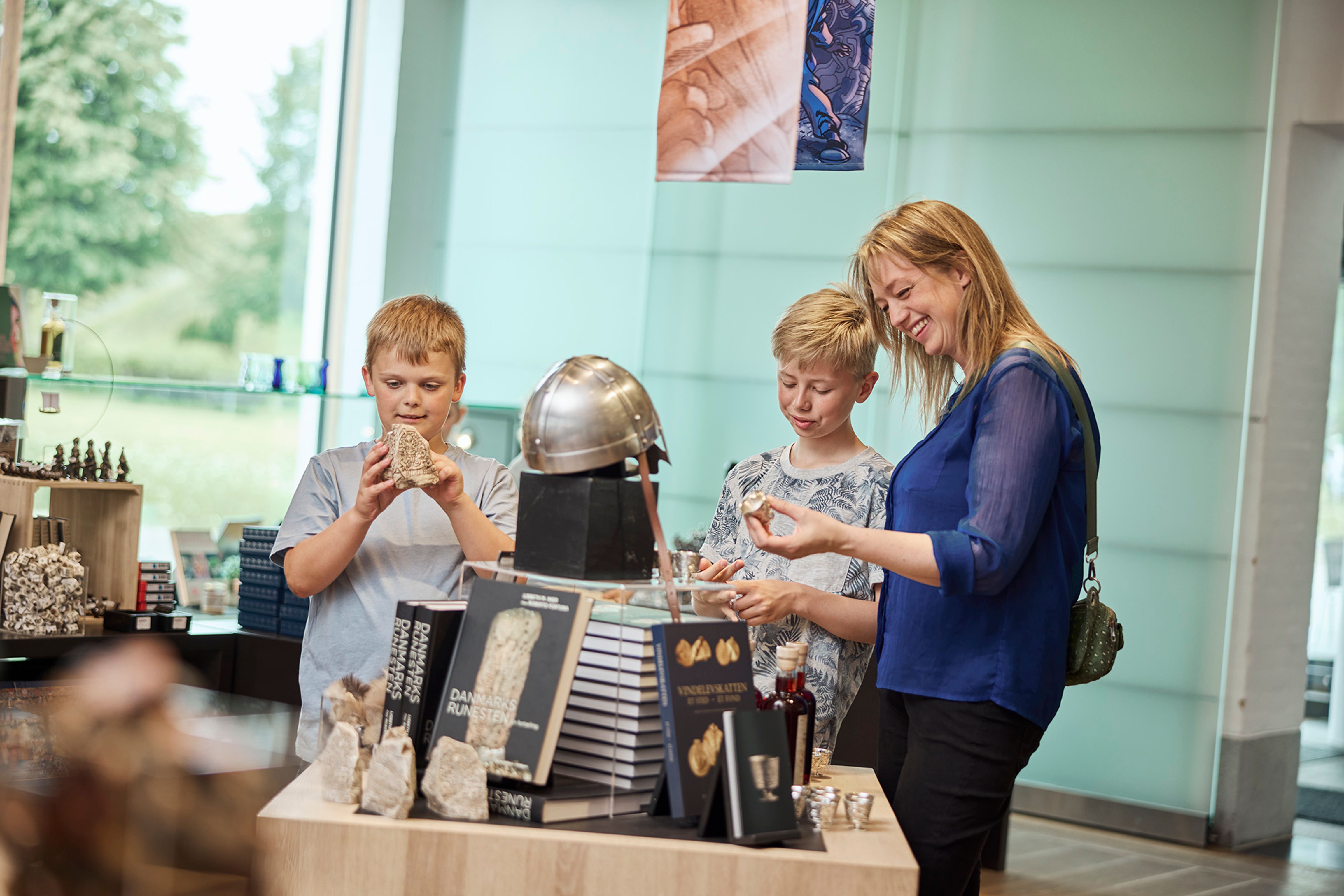 I butikken kan du finde et bredt udvalg af alt fra bøger og brugskunst til spil og delikatesser inspireret af vikingetiden. Find for eksempel en kopi af det ikoniske Jellingbæger og en håndbrygget mjød, du kan servere deri.