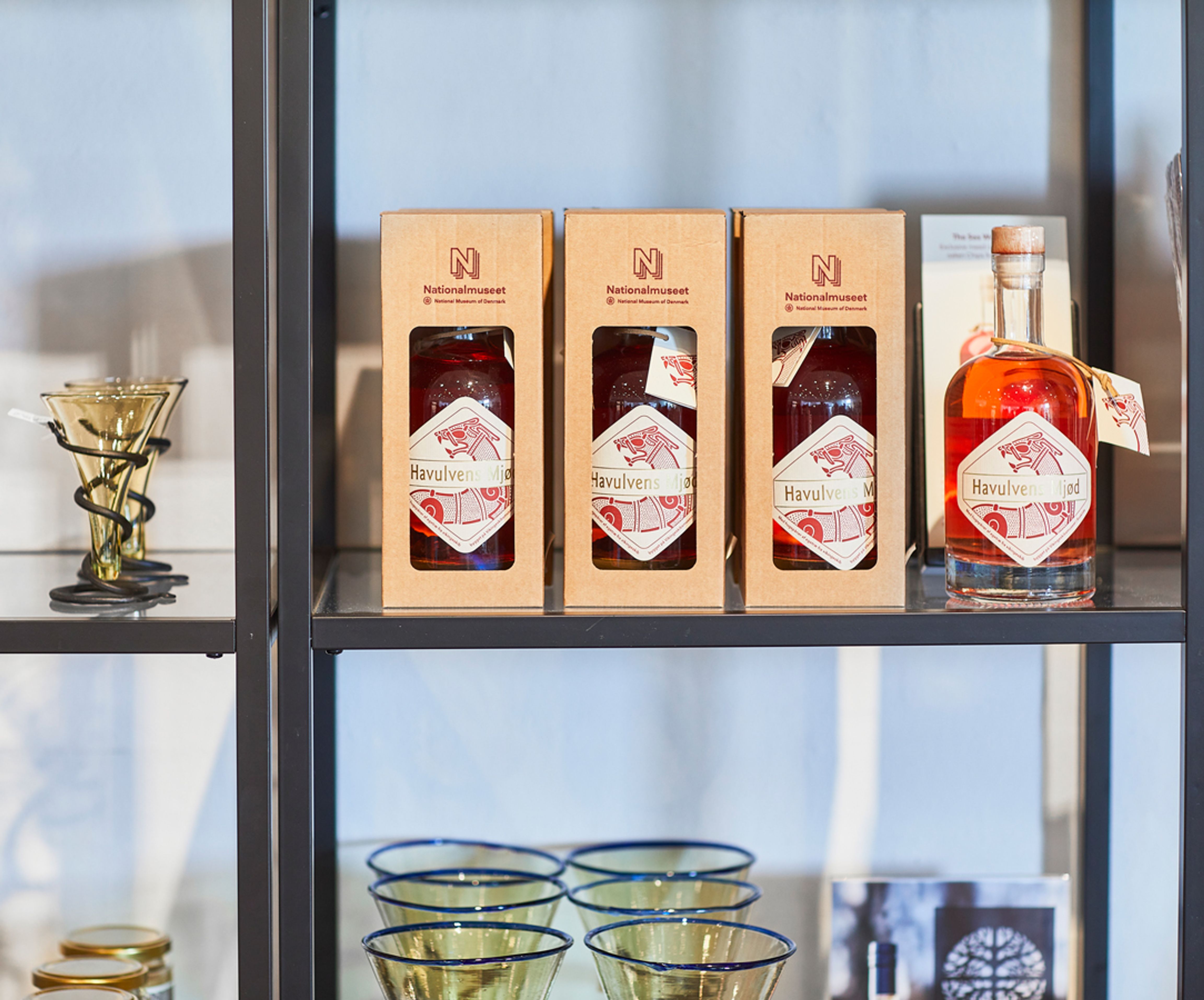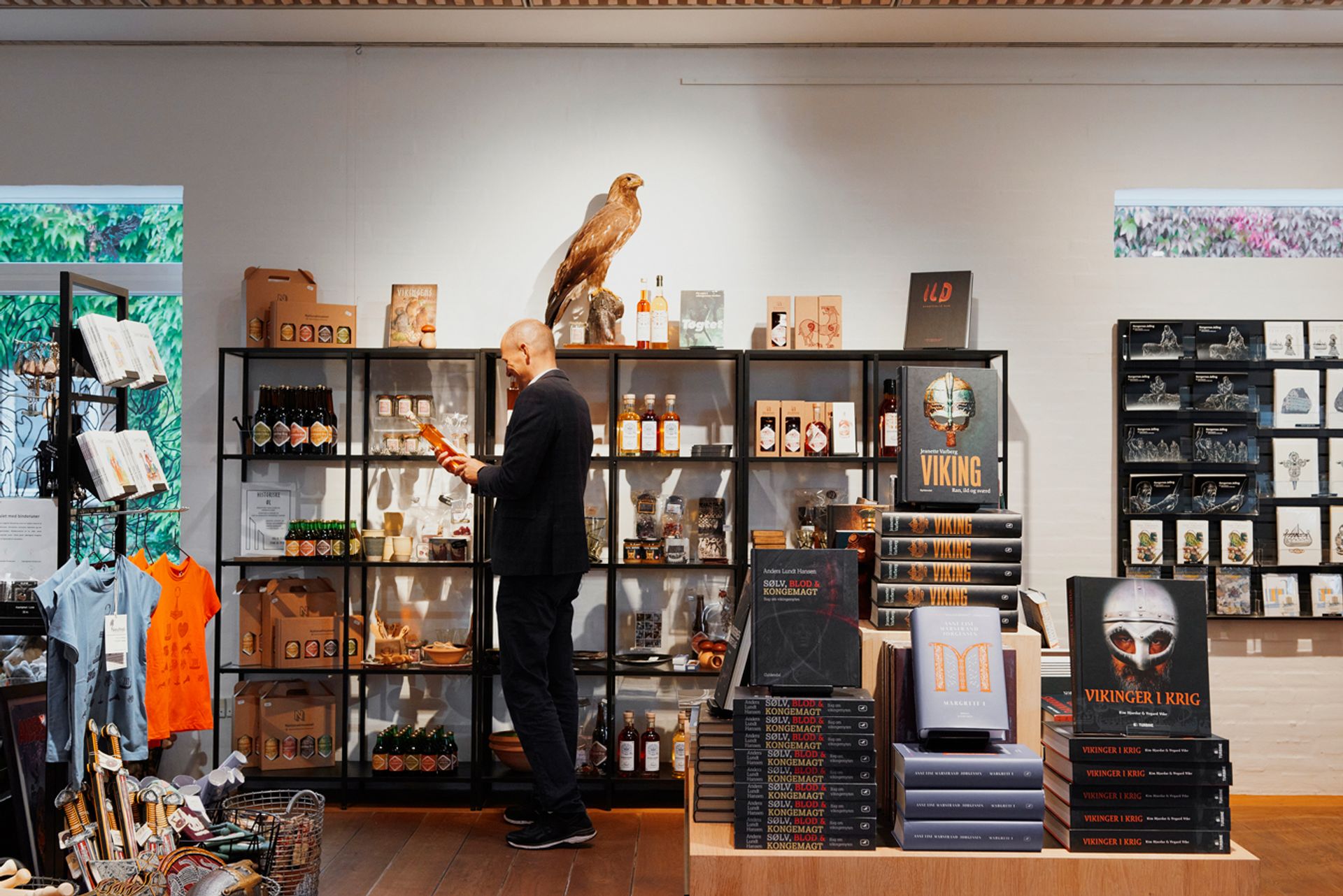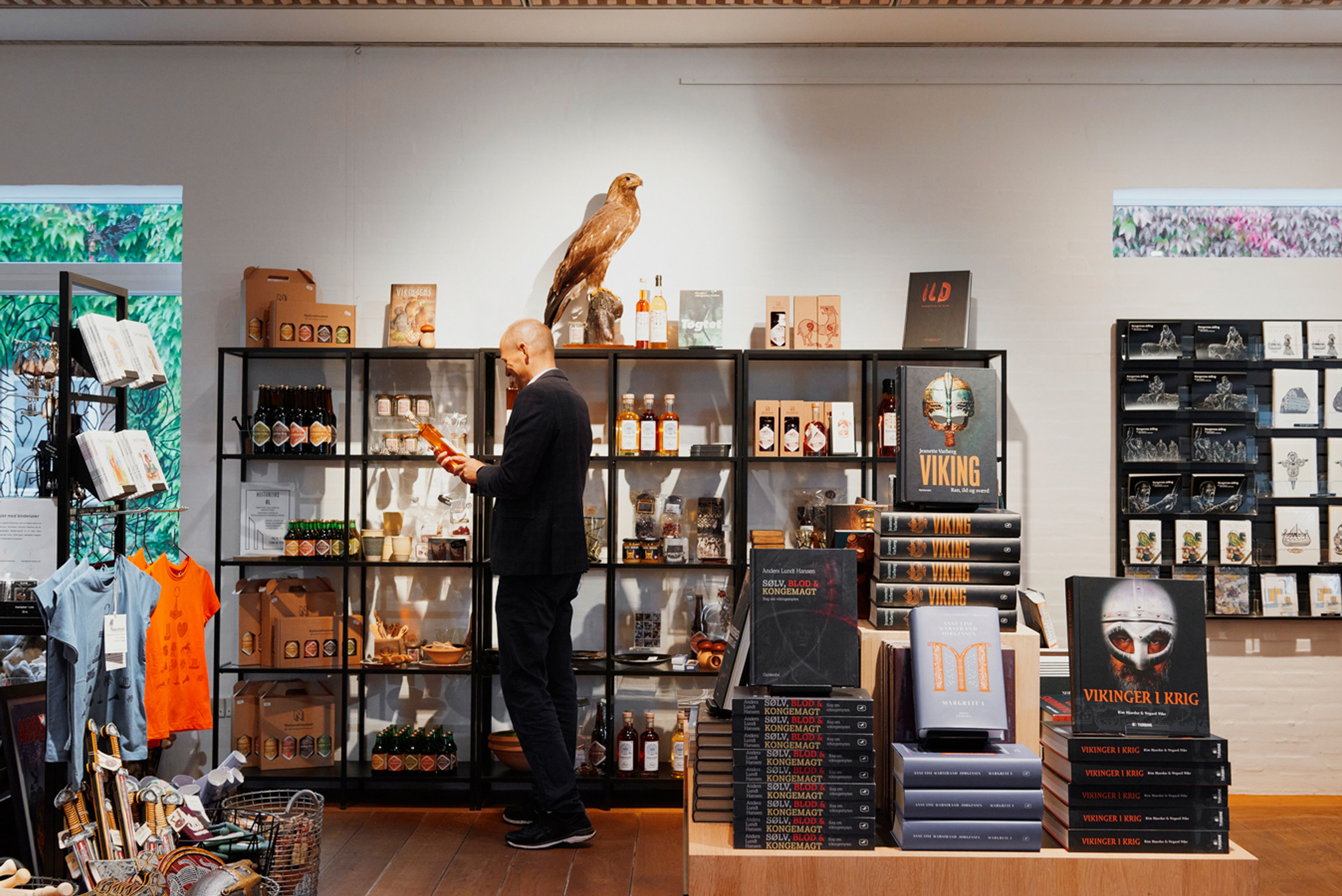 Her finder du håndplukkede ting, der fortæller historien om vikingekongernes storhed og Danmarks fødsel som nation. På hylderne er der noget for børn og voksne, om det er træsværd og T-shirts eller faglitteratur og smykker inspireret af fund fra vikingetiden. Fik vi også nævnt, at vi har en kopi af Jellingbægeret og en håndbrygget mjød, du kan servere deri?